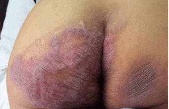 患者男,38岁,因“左侧臀部暗红色斑块11年来诊”。斑块逐渐呈疣状增生,且向周围扩展,以后中心部分的疣状增生逐渐变平,结痂脱落后留有萎缩性网状瘢痕。患者一般情况好,无全身症状,心、肺、腹无明显异常。皮肤科查体:左侧臀部可见5cm×8cm暗红色呈疣状增生的斑块,四周由结痂成鳞屑覆盖之结节向外扩展成环状或弧形,境界明显,结节的外围呈暗红色晕,形成中央网状瘢痕、边缘疣状改变和四周暗红色晕(下图)。