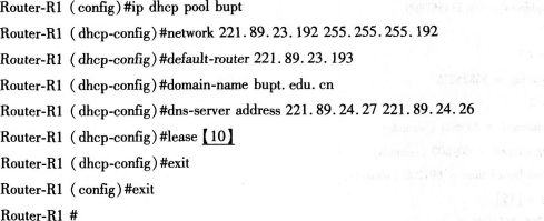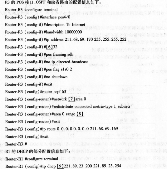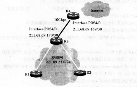 如下图所示,某校园网用l0Gbps的POS技术与Intemet相连,POS接口的帧格式是SDH。路由协议的选择方案是校园网内部采用OSPF协议,校园网与Internet的连接使用静态路由协议。校园网内的路由器R1设为DHCP服务器,可分配的IP地址是221.89.23.192/26,其中221.89.23.200-221.89.23.254地址除外,地址租用时间为5小时30分。