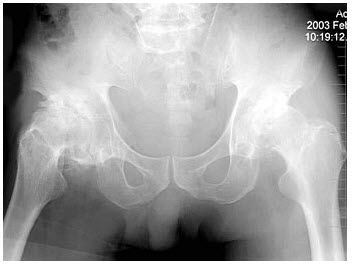 男,60岁,因双髋关节反复疼痛2年余,无明显外伤史,X线摄片如图,最可能的诊断是 A.双髋关节退行性骨关节病